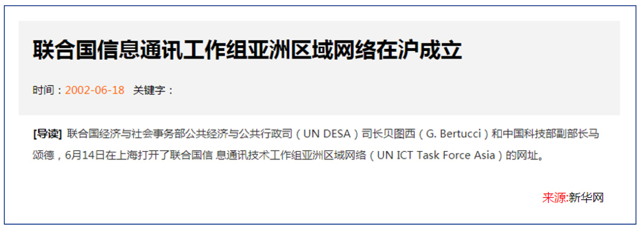 2002年7月,在中国科技部牵头和上海市政府的支持下,联合国信息通讯技术工作组顺利成立该工作组的“亚洲区域网络”,邀请新华科技集团成为该区域网络的企业成员,蔡冠深先生并捐资10万元人民币赞助经费。