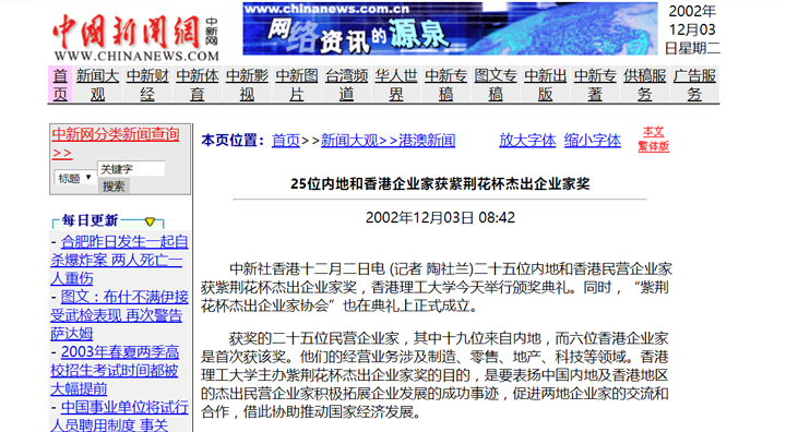 2002年7月赞助香港理工大学举办“第三届紫荆花杯杰出企业家奖”,赞助港币15万元。该活动旨表扬杰出的中国内地及香港企业家,促进香港及中国内地的工商界交流,推动中国内地工商业的发展。