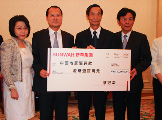 2008年5月12日,汶川地震发生,受灾严重。新华集团15日捐助港币100万元,紧急支持受灾地区。集团主席蔡冠深博士并赴绵阳灾区支援和考察灾后重建。