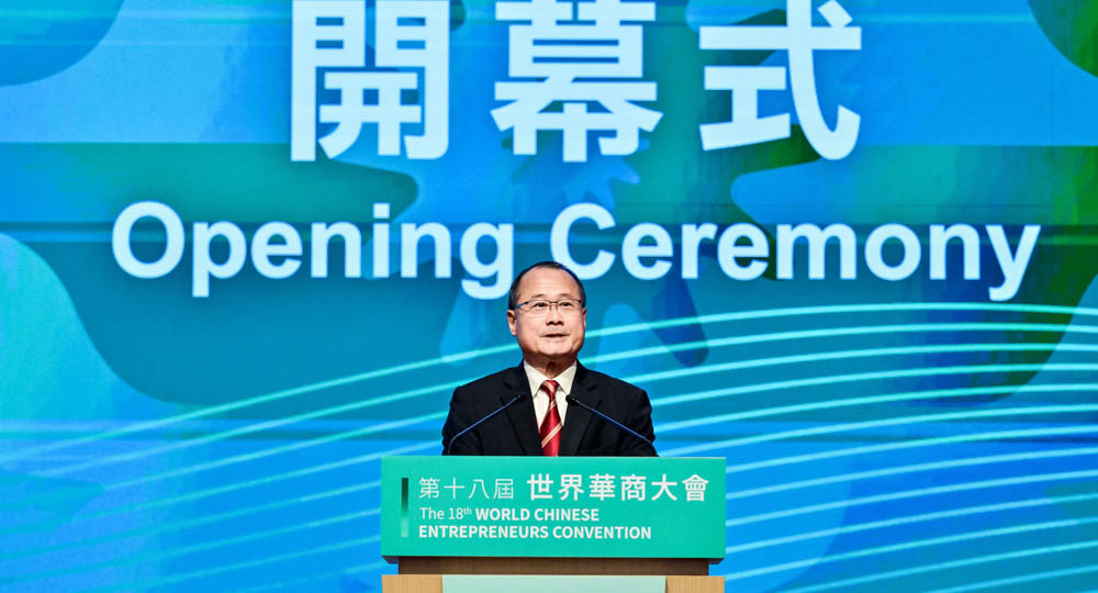 全国政协常委、香港中华总商会会长、粤港澳大湾区企业家联盟主席、香港新华集团主席蔡冠深博士,代表世界华商大会召集人组织成员——新加坡中华总商会、香港中华总商会及泰国中华总商会致欢迎辞,对第十八届世界华商大会在澳门开幕表示祝贺,并对来自全球的华商领袖与嘉宾致以欢迎。