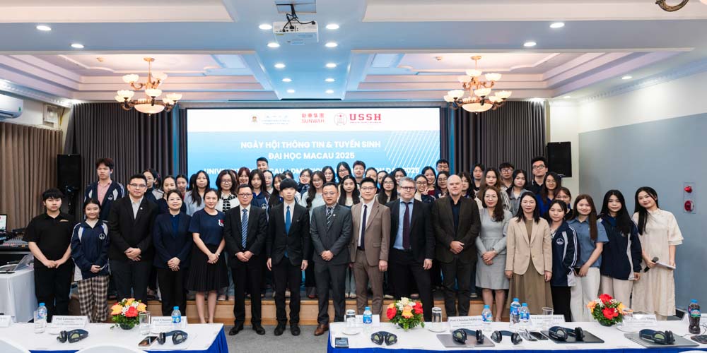 2025年11月14日至15日,澳门大学携手新华集团、越南国家大学下属人文与社会科学大学(USSH),在河内举办“澳门大学2025招生宣讲会”。会议以留学咨询和招生宣介为核心,分别于河内蔡冠深文化中心及USSH礼堂举行,旨在为越南学生提供直接了解澳大专业设置、奖学金及国际学习环境的机会,吸引近两百名来自河内多所高中及大学的学生参加。