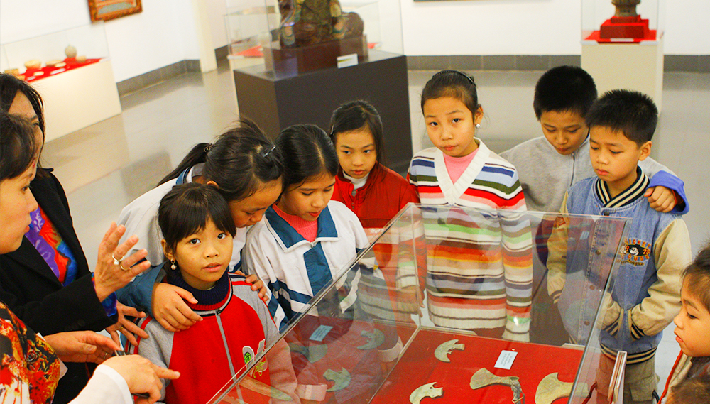 学生们参观新华基金会在河内举办的越南千年文化美术展览