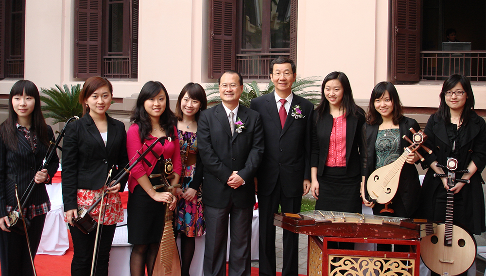 新华基金会邀请北京大学民乐团到河内为越南千年文化展览开幕演奏。蔡冠深博士与时任中国驻越南大使孙国祥及民乐团团员合影