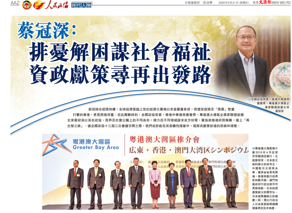 新冠肺炎疫情持续,全球经济面临上世纪经济大萧条以来最严重衰退,而遭受疫情及“黑暴”双重打击的香港,更是困境深重。在此艰难时刻,全国政协常委、香港中华总商会会长、粤港澳大湾区企业家联盟创会主席蔡冠深以其在政协、商界及社会公职上的不同身份,竭力在不同领域谋求良方妙策,冀协助香港纾困解难,踏上“再出发之路”。值全国政协十三届三次会议召开之际,我们或许能在其前瞻性提案中,窥探其献策扶港的思路和理想。