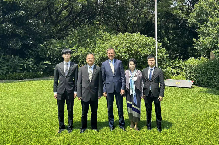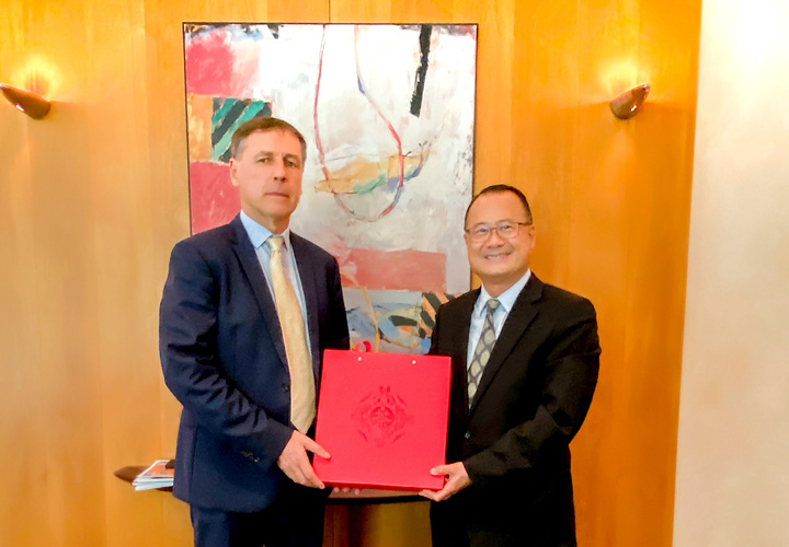 10月19号上午,粤港澳大湾区企业家联盟主席、新华集团主席蔡冠深博士一行在金边前往法国驻柬埔寨大使馆,会晤Jacques Pellet大使。